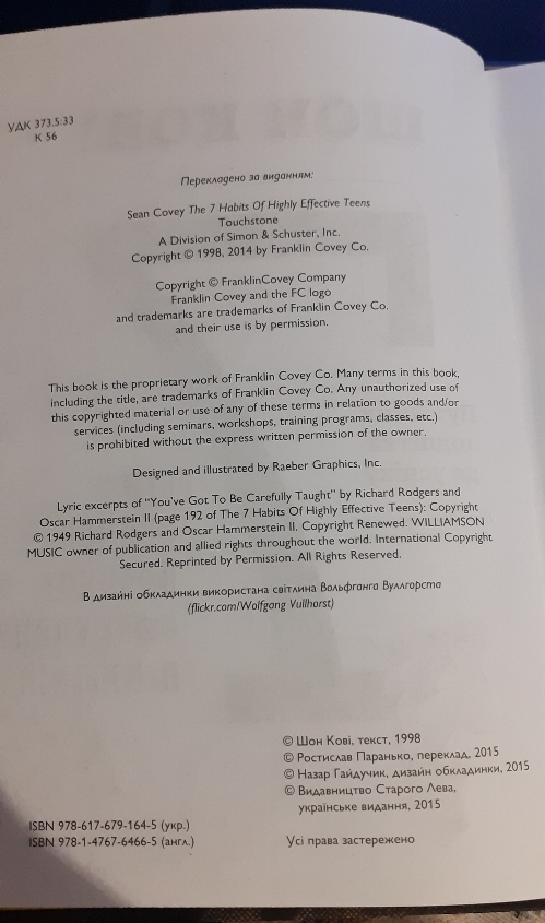 Видання 2019 року українською мовою (переклад з англійської Ростислава Парацько). Видавництво Старого Лева. • Практичні поради для формування корисних звичок • Розвиток лідерських якостей та самодисципліни • Методи досягнення цілей та особистісного зростання • Адаптовано спеціально для підліткової аудitorії Книга допоможе молодим людям розкрити свій потенціал, навчитися ефективно планувати час та будувати успішне майбутнє. Базується на принципах, викладених у легендарній роботі Стівена Кові. Відправка Укрпоштою тільки після повної оплати. Додатково оплачується: Пакування-18 грн (до відправлення) Пересилання Укрпоштою по Києву-45 грн (при отриманні) Пересилання Укрпоштою по Україні-55 грн (при отриманні) +380682566895 VIBER |